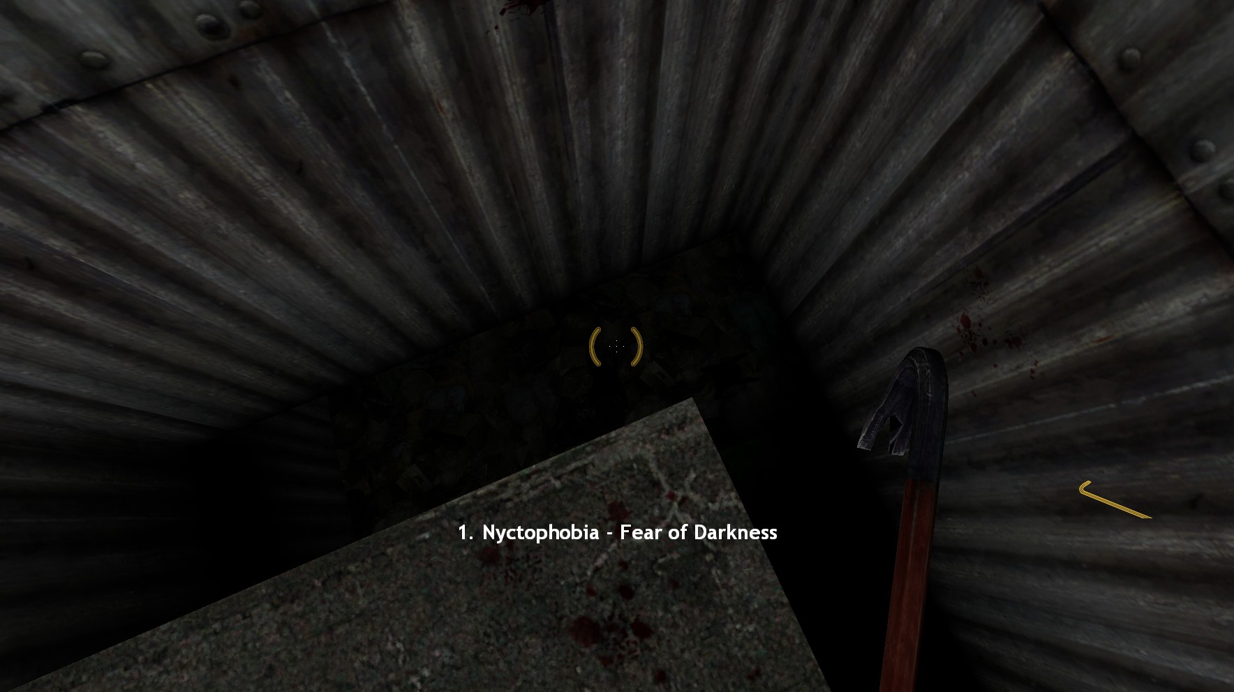 The player at this point will notice that the only direction to go is down; a short fall where the landing area is shrouded in darkness. The player doesn’t have a flashlight or anything at this point, so it’s a bit of a leap of faith. The words “1. Nyctophobia – Fear of Darkness” appear on the screen right before the player steps over the edge.