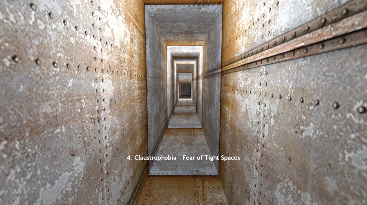 As the player reaches a dead end in the shaft, the words “5. Thanatophobia – Fear of Death” appears. If they turn around, they should have at least 5 seconds or so to see the metal piece slowly approaching them to, presumably, crush them to death. When the metal piece gets close enough, a crushing sound plays and the screen goes black.